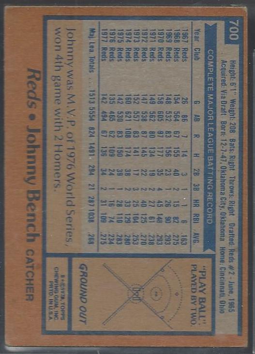 #700 Johnny Bench 1978 Topps Baseball Card (Grade: Nrmt-Mt)