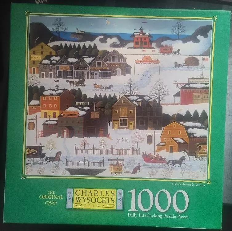 This Charles Wysocki Americana puzzle features a vibrant autumn scene of Fairhaven. With 1000+ pieces, it provides hours of fun and challenge for puzzle enthusiasts. The puzzle is from 1999 and has been previously owned, but all pieces are accounted for and in excellent shape. The puzzle depicts a quaint New England town in its autumn splendor, with warm colors and charming details. The Brand of the puzzle is Hasbro. The puzzle is perfect for those who enjoy contemporary jigsaw puzzles and appreciate the work of popular puzzle artist Charles Wysocki. The Color of the puzzle is Multi-Color, making it visually appealing. It belongs to the categories of Jigsaw, Contemporary Puzzles, Puzzles, and Toys & Hobbies. The puzzle’s Year is from 1999 and the Number of Pieces is between 1000 to 1999. Get ready to enjoy hours of puzzle-solving fun with this beautiful puzzle!